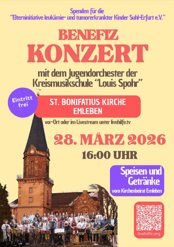 BENEFIZ-Konzert mit dem Jugendorchester der Kreismusikschule "Louis Spohr" für die "Elterninitiative leukämie- und tumorerkrankter Kinder Suhl-Erfurt e. V. am 28. März 2026 16:00 Uhr in der St. Bonifatius Kirche Emleben